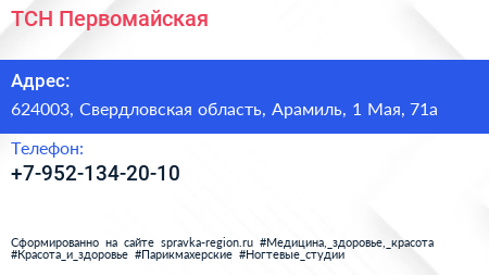 ТСН Первомайская по адресу 624003, Свердловская область, Арамиль, 1 Мая, 71а в дальнейшем Организация, размещена в следующих категориях: