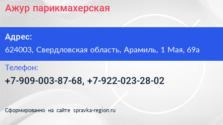 Ажур, парикмахерская по адресу 624003, Свердловская область, Арамиль, 1 Мая, 69а в дальнейшем Организация, размещена в следующих категориях: