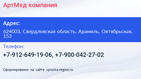 АртМед, компания по адресу 624003, Свердловская область, Арамиль, Октябрьская, 153 в дальнейшем Организация, размещена в следующих категориях: