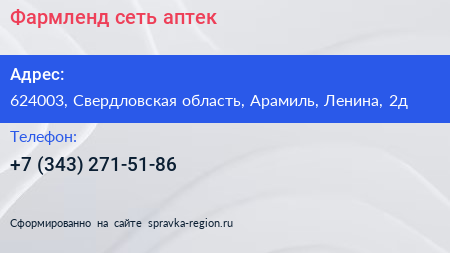 Фармленд, сеть аптек по адресу 624003, Свердловская область, Арамиль, Ленина, 2д в дальнейшем Организация, размещена в следующих категориях: