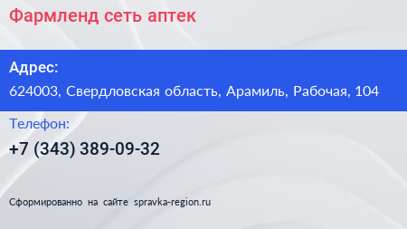 Фармленд, сеть аптек по адресу 624003, Свердловская область, Арамиль, Рабочая, 104 в дальнейшем Организация, размещена в следующих категориях: