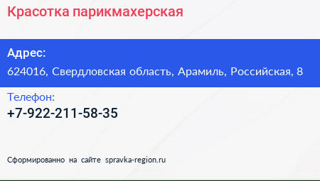Красотка, парикмахерская по адресу 624016, Свердловская область, Арамиль, Российская, 8 в дальнейшем Организация, размещена в следующих категориях: