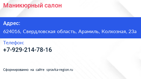 Маникюрный салон по адресу 624016, Свердловская область, Арамиль, Колхозная, 23а в дальнейшем Организация, размещена в следующих категориях: