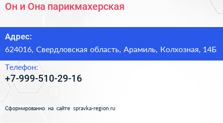 Он и Она, парикмахерская по адресу 624016, Свердловская область, Арамиль, Колхозная, 14Б в дальнейшем Организация, размещена в следующих категориях: