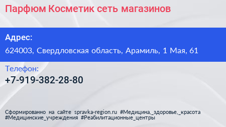 Парфюм Косметик, сеть магазинов по адресу 624003, Свердловская область, Арамиль, 1 Мая, 61 в дальнейшем Организация, размещена в следующих категориях: