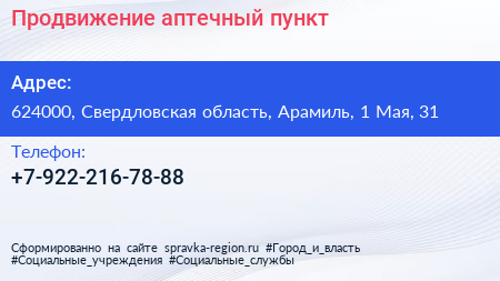 Продвижение, аптечный пункт по адресу 624000, Свердловская область, Арамиль, 1 Мая, 31 в дальнейшем Организация, размещена в следующих категориях: