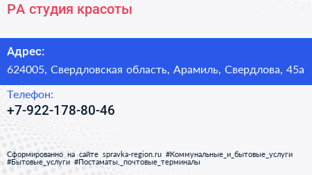 РА, студия красоты по адресу 624005, Свердловская область, Арамиль, Свердлова, 45а в дальнейшем Организация, размещена в следующих категориях: