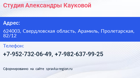 Студия Александры Кауковой по адресу 624003, Свердловская область, Арамиль, Пролетарская, 82/12 в дальнейшем Организация, размещена в следующих категориях: