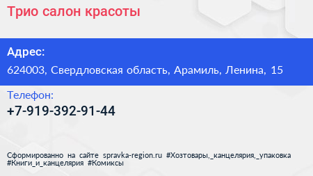 Трио, салон красоты по адресу 624003, Свердловская область, Арамиль, Ленина, 15 в дальнейшем Организация, размещена в следующих категориях: