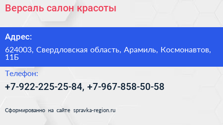 Версаль, салон красоты по адресу 624003, Свердловская область, Арамиль, Космонавтов, 11Б в дальнейшем Организация, размещена в следующих категориях: