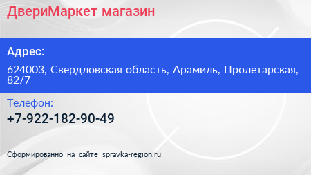 ДвериМаркет, магазин по адресу 624003, Свердловская область, Арамиль, Пролетарская, 82/7 в дальнейшем Организация, размещена в следующих категориях: