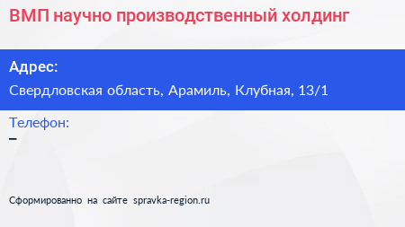 ВМП, научно-производственный холдинг по адресу Свердловская область, Арамиль, Клубная, 13/1 в дальнейшем Организация, размещена в следующих категориях:
