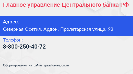 Главное управление Центрального банка РФ по адресу Северная Осетия, Ардон, Пролетарская улица, 93 в дальнейшем Организация, размещена в следующих категориях: