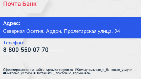 Почта Банк по адресу Северная Осетия, Ардон, Пролетарская улица, 94 в дальнейшем Организация, размещена в следующих категориях: