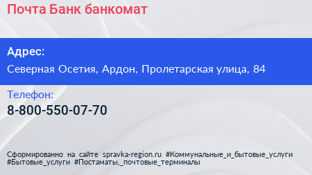 Почта Банк, банкомат по адресу Северная Осетия, Ардон, Пролетарская улица, 84 в дальнейшем Организация, размещена в следующих категориях: