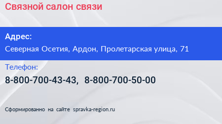 Связной, салон связи по адресу Северная Осетия, Ардон, Пролетарская улица, 71 в дальнейшем Организация, размещена в следующих категориях: