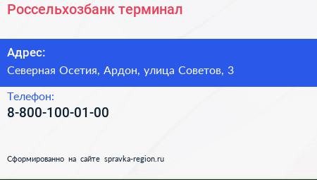 Россельхозбанк, терминал по адресу Северная Осетия, Ардон, улица Советов, 3 в дальнейшем Организация, размещена в следующих категориях: