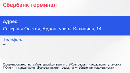 Сбербанк, терминал по адресу Северная Осетия, Ардон, улица Калинина, 14 в дальнейшем Организация, размещена в следующих категориях:
