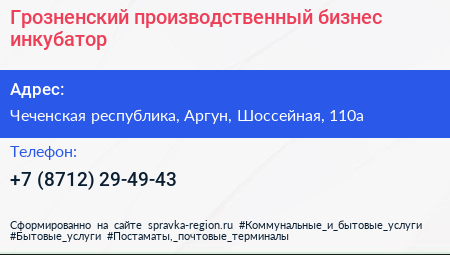 Грозненский производственный бизнес-инкубатор по адресу Чеченская республика, Аргун, Шоссейная, 110а в дальнейшем Организация, размещена в следующих категориях: