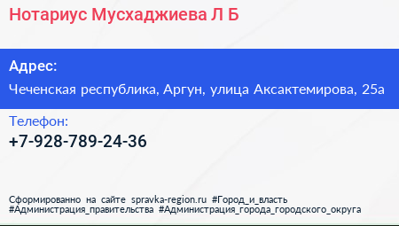 Нотариус Мусхаджиева Л.Б. по адресу Чеченская республика, Аргун, улица Аксактемирова, 25а в дальнейшем Организация, размещена в следующих категориях:
