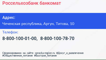 Россельхозбанк, банкомат по адресу Чеченская республика, Аргун, Титова, 10 в дальнейшем Организация, размещена в следующих категориях: