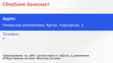 СберБанк, банкомат по адресу Чеченская республика, Аргун, Карьерная, 1 в дальнейшем Организация, размещена в следующих категориях: