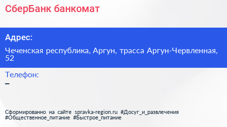 СберБанк, банкомат по адресу Чеченская республика, Аргун, трасса Аргун-Червленная, 52 в дальнейшем Организация, размещена в следующих категориях: