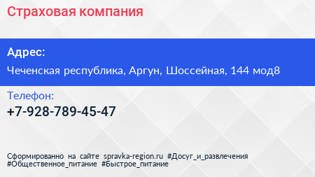 Страховая компания по адресу Чеченская республика, Аргун, Шоссейная, 144 мод8 в дальнейшем Организация, размещена в следующих категориях: