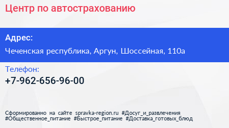 Центр по автострахованию по адресу Чеченская республика, Аргун, Шоссейная, 110а в дальнейшем Организация, размещена в следующих категориях: