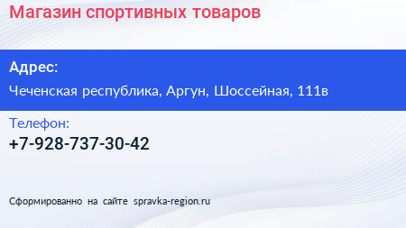 Магазин спортивных товаров по адресу Чеченская республика, Аргун, Шоссейная, 111в в дальнейшем Организация, размещена в следующих категориях: