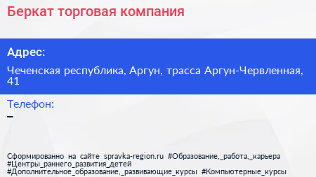 Беркат, торговая компания по адресу Чеченская республика, Аргун, трасса Аргун-Червленная, 41 в дальнейшем Организация, размещена в следующих категориях:
