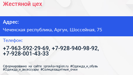 Жестяной цех по адресу Чеченская республика, Аргун, Шоссейная, 75 в дальнейшем Организация, размещена в следующих категориях:
