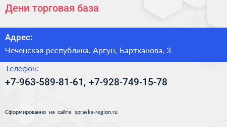 Дени, торговая база по адресу Чеченская республика, Аргун, Бартханова, 3 в дальнейшем Организация, размещена в следующих категориях: