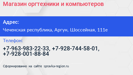 Магазин оргтехники и компьютеров по адресу Чеченская республика, Аргун, Шоссейная, 111е в дальнейшем Организация, размещена в следующих категориях: