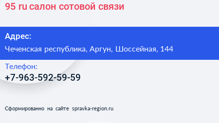 95.ru, салон сотовой связи по адресу Чеченская республика, Аргун, Шоссейная, 144 в дальнейшем Организация, размещена в следующих категориях: