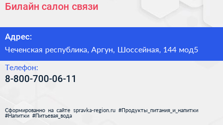 Билайн, салон связи по адресу Чеченская республика, Аргун, Шоссейная, 144 мод5 в дальнейшем Организация, размещена в следующих категориях: