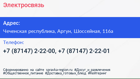 Электросвязь по адресу Чеченская республика, Аргун, Шоссейная, 116а в дальнейшем Организация, размещена в следующих категориях: