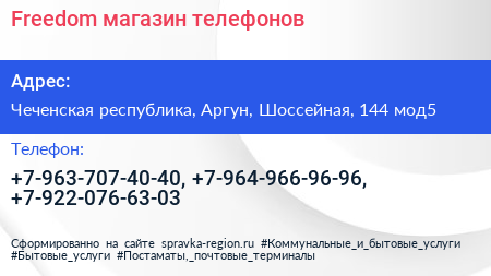 Freedom, магазин телефонов по адресу Чеченская республика, Аргун, Шоссейная, 144 мод5 в дальнейшем Организация, размещена в следующих категориях: