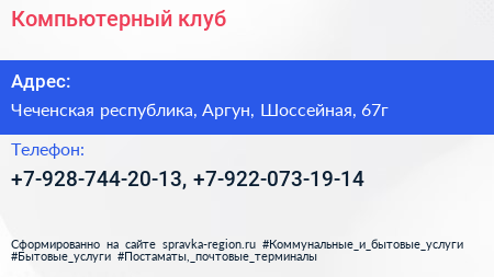 Компьютерный клуб по адресу Чеченская республика, Аргун, Шоссейная, 67г в дальнейшем Организация, размещена в следующих категориях: