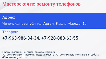 Мастерская по ремонту телефонов по адресу Чеченская республика, Аргун, Карла Маркса, 1а в дальнейшем Организация, размещена в следующих категориях:
