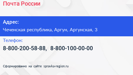 Почта России по адресу Чеченская республика, Аргун, Аргунская, 3 в дальнейшем Организация, размещена в следующих категориях: