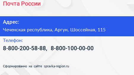 Почта России по адресу Чеченская республика, Аргун, Шоссейная, 115 в дальнейшем Организация, размещена в следующих категориях: