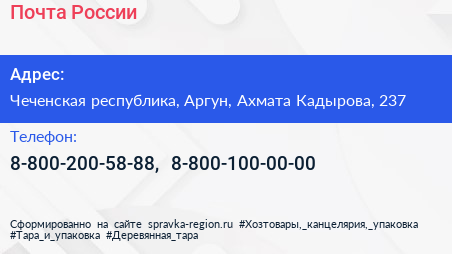 Почта России по адресу Чеченская республика, Аргун, Ахмата Кадырова, 237 в дальнейшем Организация, размещена в следующих категориях: