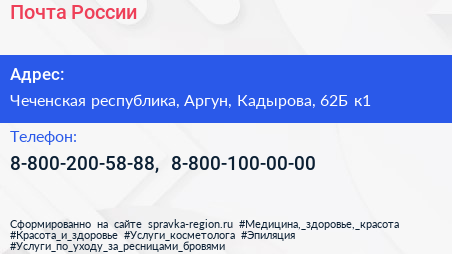 Почта России по адресу Чеченская республика, Аргун, Кадырова, 62Б к1 в дальнейшем Организация, размещена в следующих категориях: