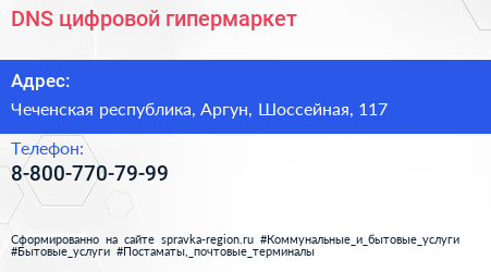 DNS, цифровой гипермаркет по адресу Чеченская республика, Аргун, Шоссейная, 117 в дальнейшем Организация, размещена в следующих категориях: