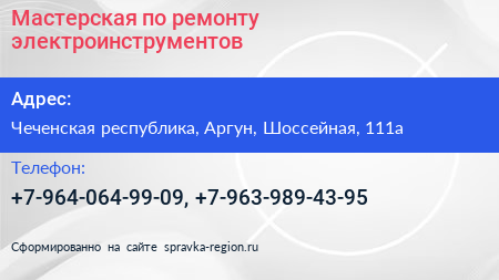 Мастерская по ремонту электроинструментов по адресу Чеченская республика, Аргун, Шоссейная, 111а в дальнейшем Организация, размещена в следующих категориях:
