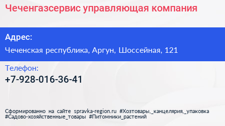 Чеченгазсервис, управляющая компания по адресу Чеченская республика, Аргун, Шоссейная, 121 в дальнейшем Организация, размещена в следующих категориях: