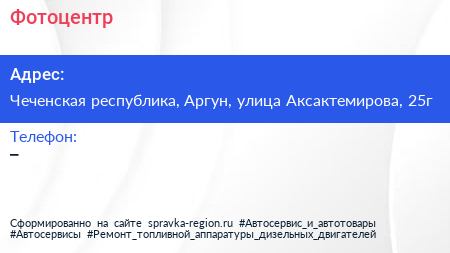 Фотоцентр по адресу Чеченская республика, Аргун, улица Аксактемирова, 25г в дальнейшем Организация, размещена в следующих категориях: