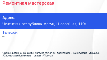 Ремонтная мастерская по адресу Чеченская республика, Аргун, Шоссейная, 110а в дальнейшем Организация, размещена в следующих категориях: