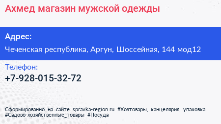 Ахмед, магазин мужской одежды по адресу Чеченская республика, Аргун, Шоссейная, 144 мод12 в дальнейшем Организация, размещена в следующих категориях: